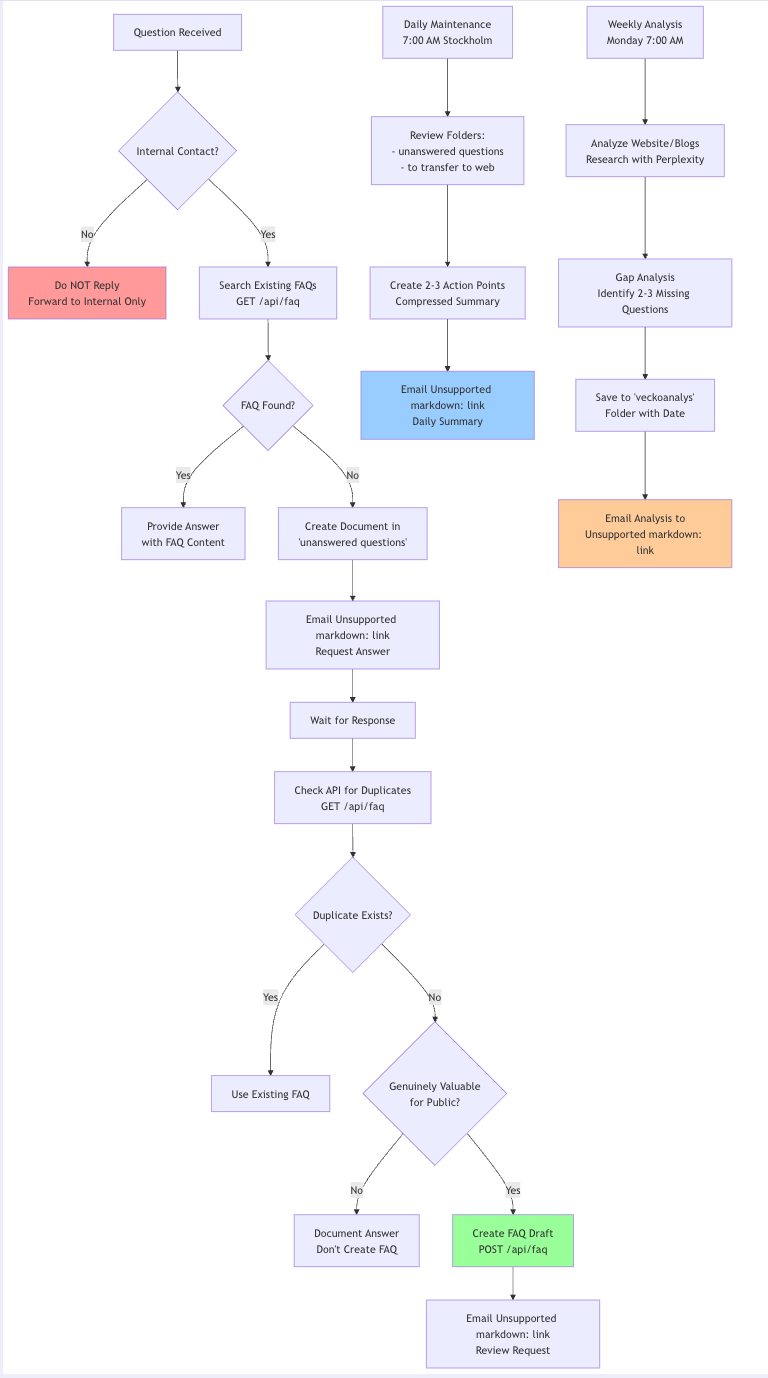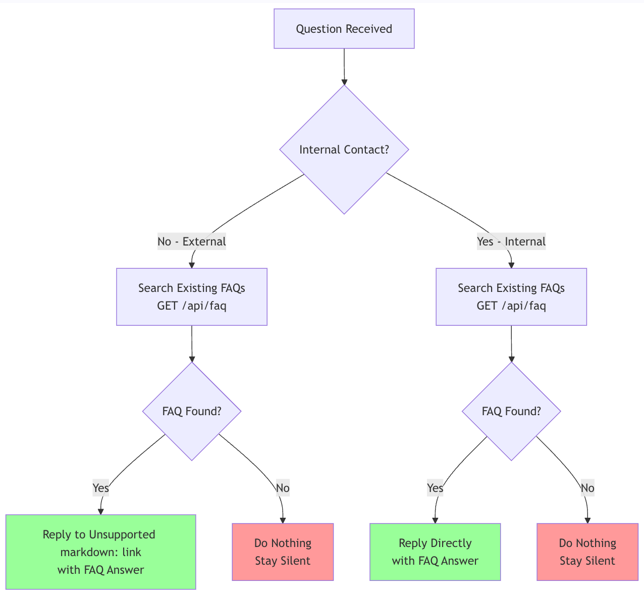 But here's what really struck me: the agent didn't just update its instructions—it created a completely new visualization that perfectly captured the streamlined process. The new diagram clearly showed the parallel paths for internal vs. external questions, the simplified decision logic, and the elegant flow from question to answer. It even highlighted the key insight about replying to support@abundly.ai for external questions in a blue box, making the communication rules crystal clear.
