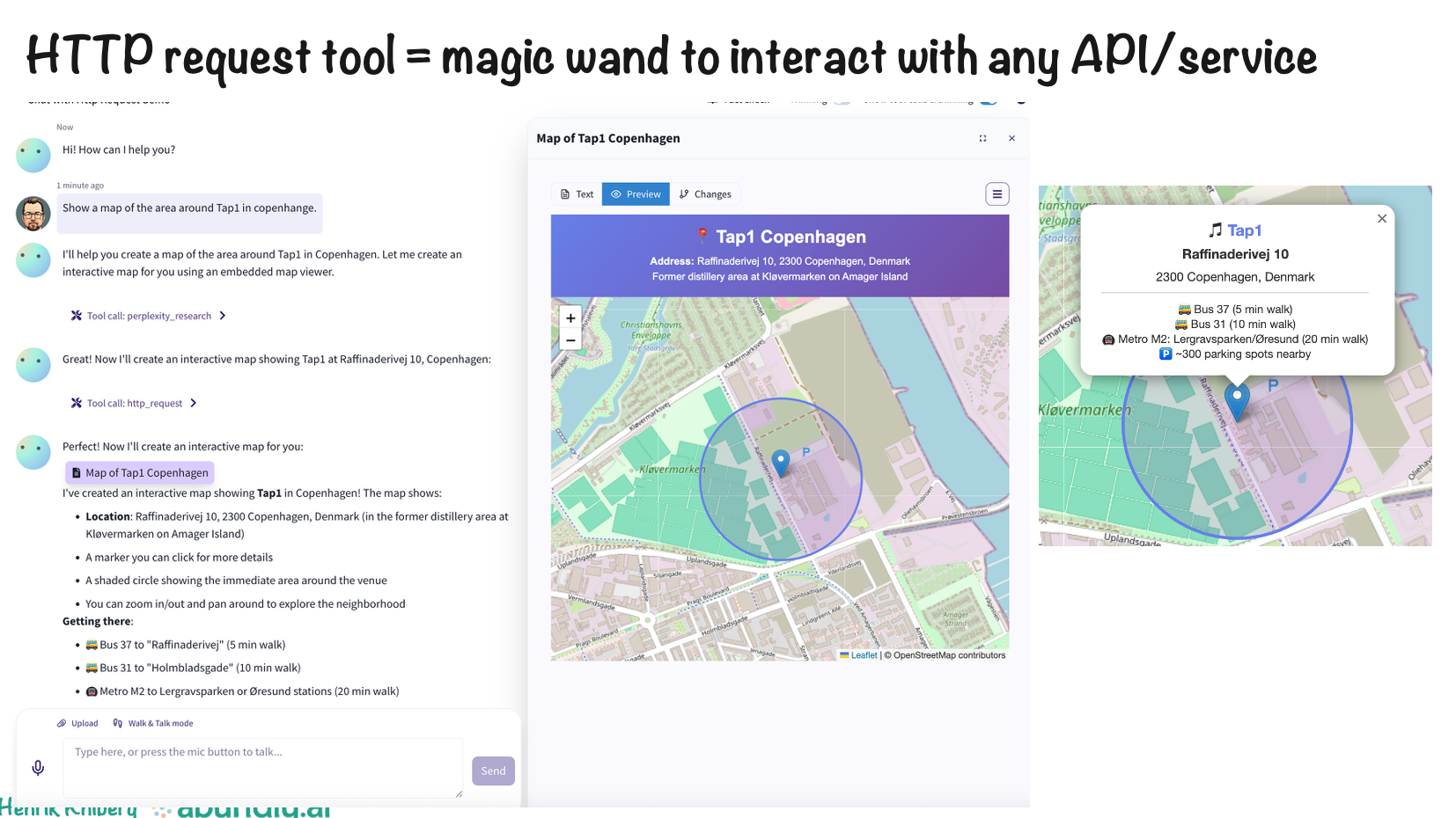 - Made an agent that checked the latest updates in github, posted summary on slack. Then I asked it to call me on my phone (voice call!), describe the changes in Danish, and then pretend to get really angry at me for not speaking danish back. Several people asked me afterwards if that was actually real, because it seem almost unbelievable. Yes it was real, the Voice Call capability in our platform is a combination of Twilio + Open AI realtime API.
