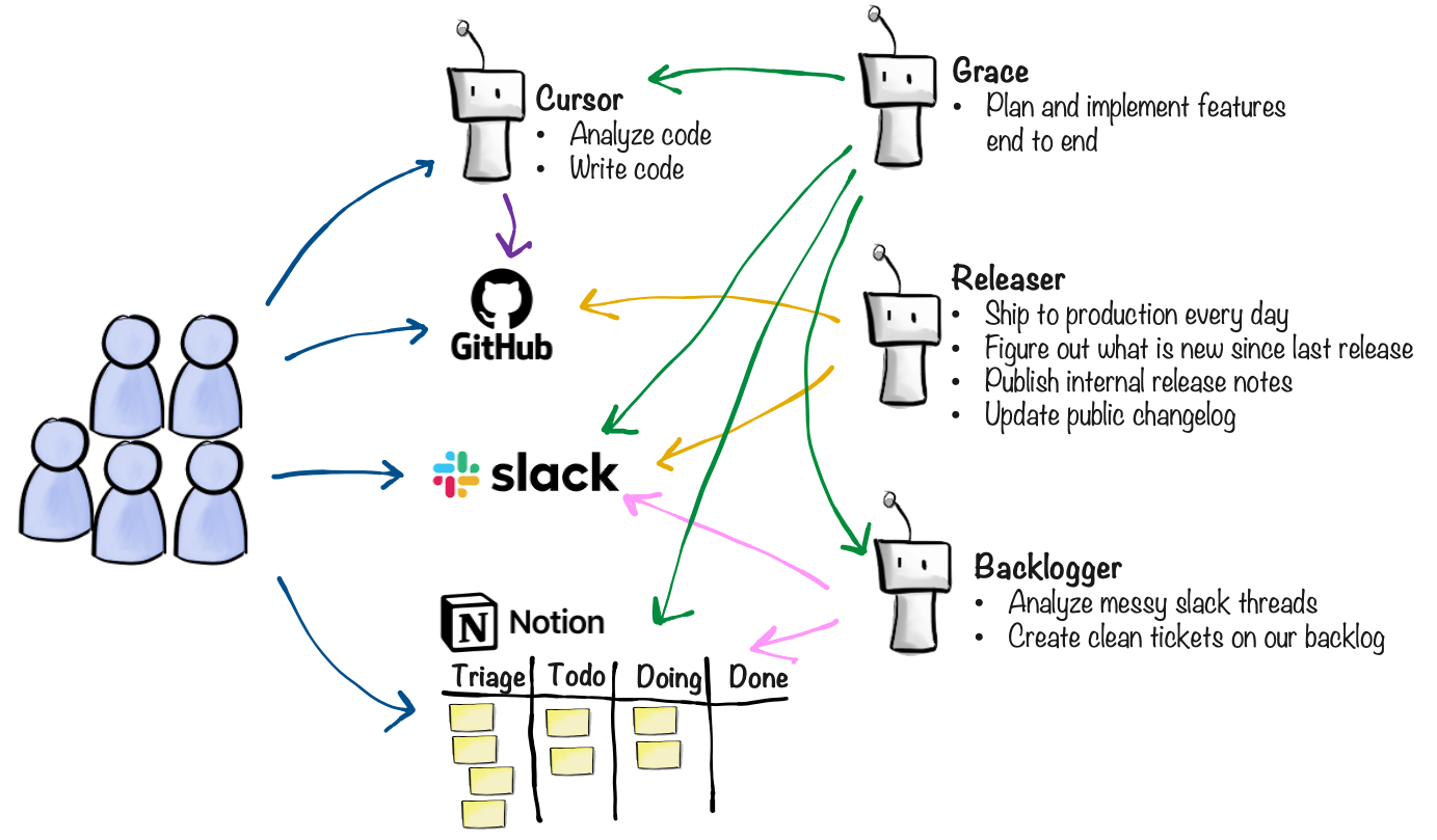 - Grace: a higher-level "colleague" agent that handles stakeholder requests from Slack all the way to pull request, coordinating with Cursor and the other agents