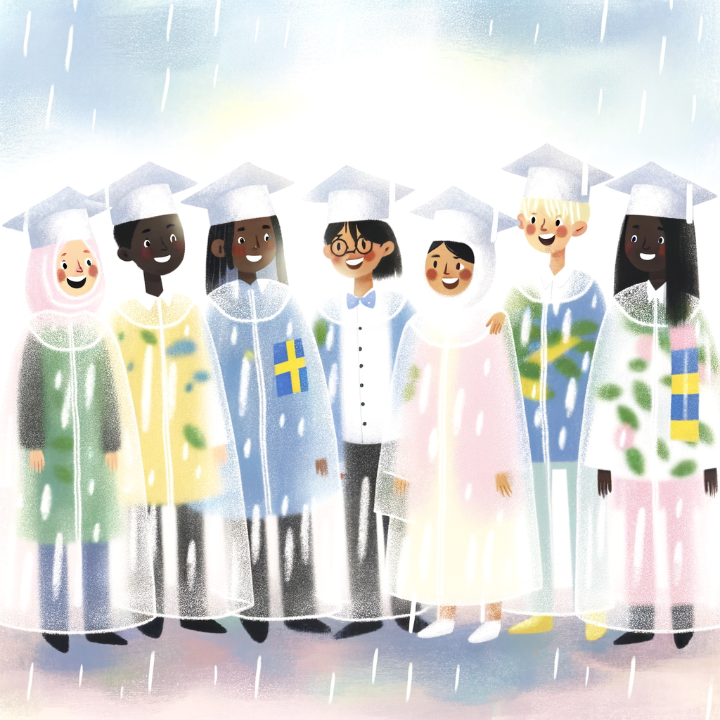 In a charming town in Sweden, where summer dreams were beginning to bloom, there was a group of clever young students who had a wonderful idea. They noticed that every year, when graduation day came around, their fellow students worried about their beautiful white celebration clothes getting wet in the unpredictable spring weather.