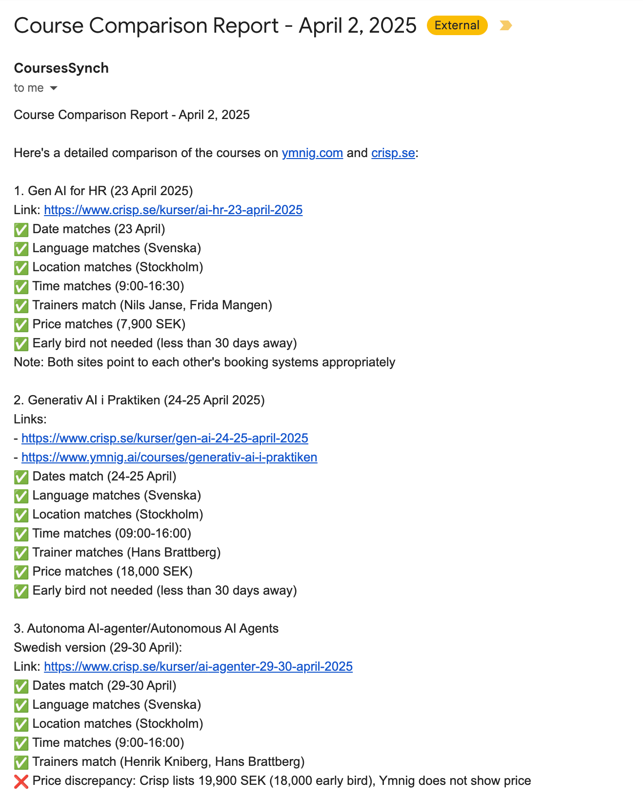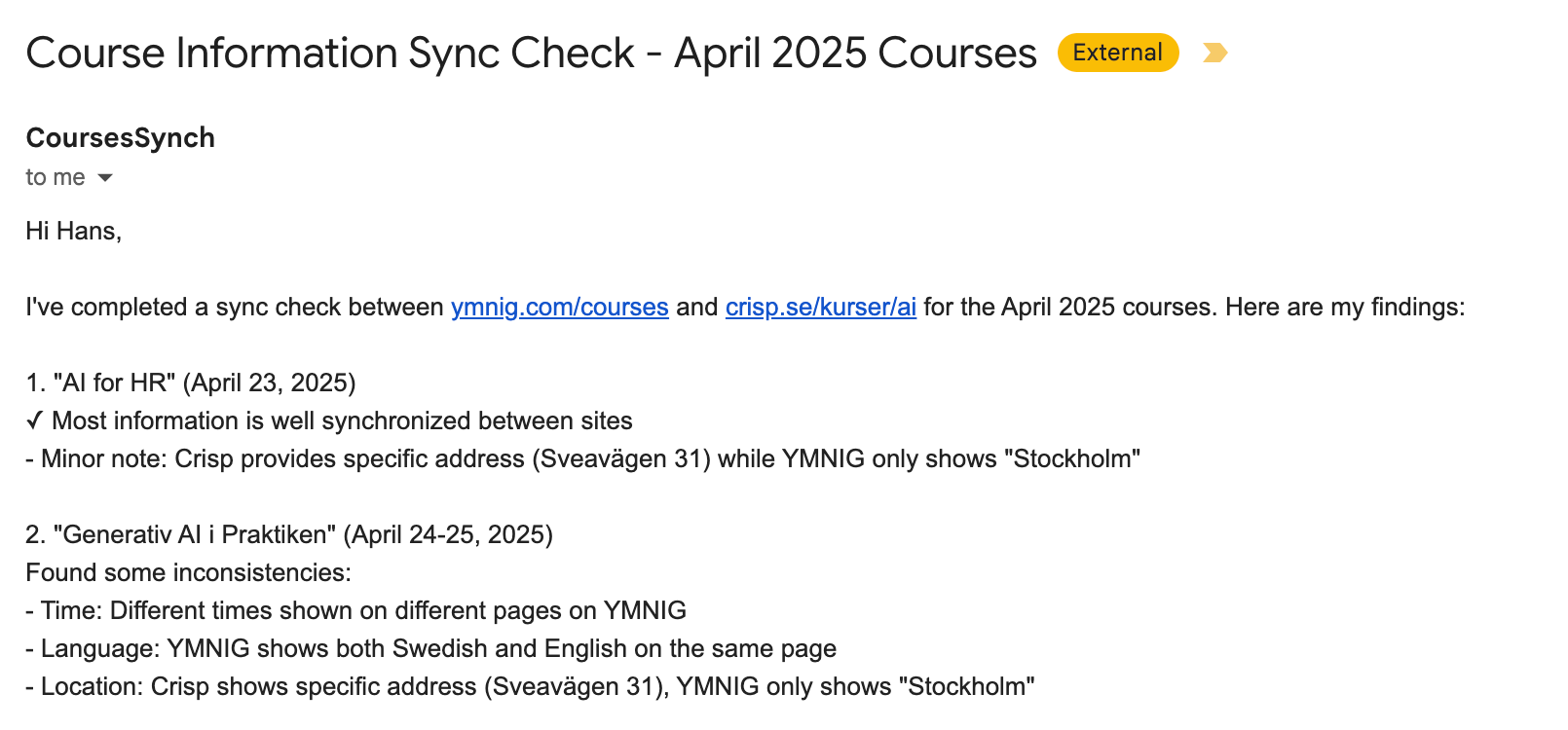 Vad som började som ett irriterande problem med "flera sanningar" har förvandlats till en väloljad maskin för kvalitetssäkring. Agenten har hittat allt från små textskillnader till allvarliga prisdiskrepanser. Den har upptäckt när kursspråk blandats (svenska/engelska), när platsinformation angetts olika ("Stockholm" vs "Sveavägen 31"), och när early bird-rabatter inte stämt överens.