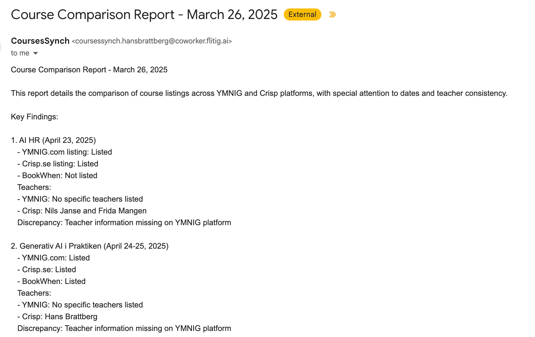 En berättelse om hur ett vardagligt problem med osynkroniserad kursinformation över olika plattformar löstes genom att skapa en autonom AI-agent. Agenten övervakar kontinuerligt kursinformation, upptäcker skillnader i datum, priser och beskrivningar, och levererar veckovisa rapporter som säkerställer att all information är korrekt och konsistent.