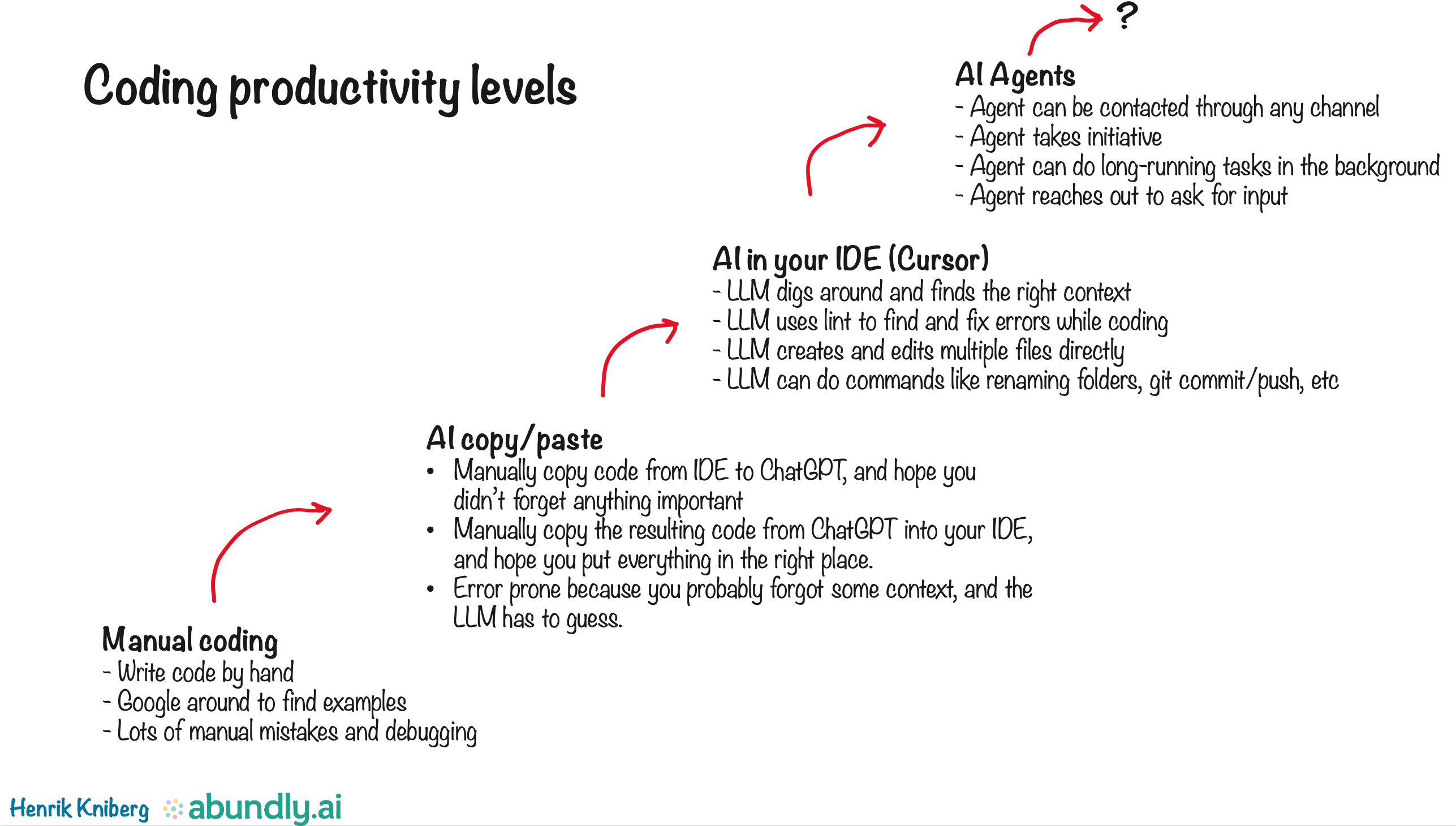- Coding productivity has evolved through four stages: Manual coding → copy-paste → AI in the IDE → autonomous agents. Each one a major productivity jump.