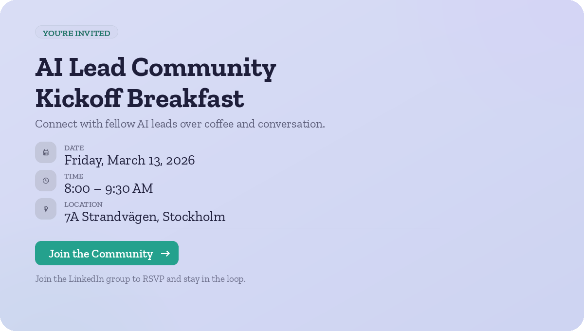 Join us for the first meetup of the AI Lead Community – a space for practitioners leading AI adoption in their organizations. Over coffee and breakfast, we'll share experiences, discuss what's working (and what's not), and connect with others navigating similar challenges. Casual format, real conversations.