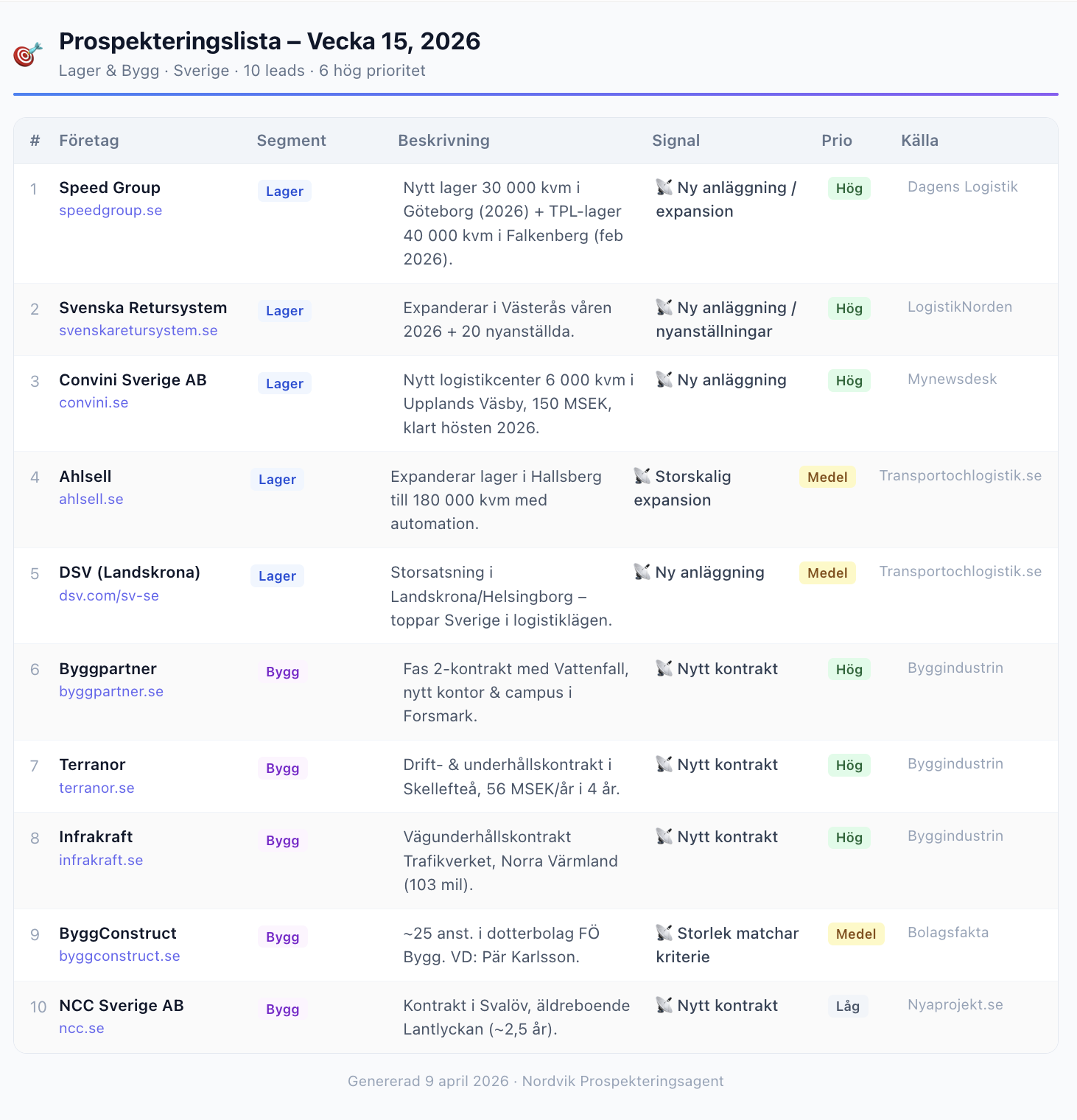 Lead Intelligence-agenten kompletterar varje prospekt med företagsdata, kontaktpersoner och köpsignaler — så att ditt team ringer rätt samtal, inte bara många.