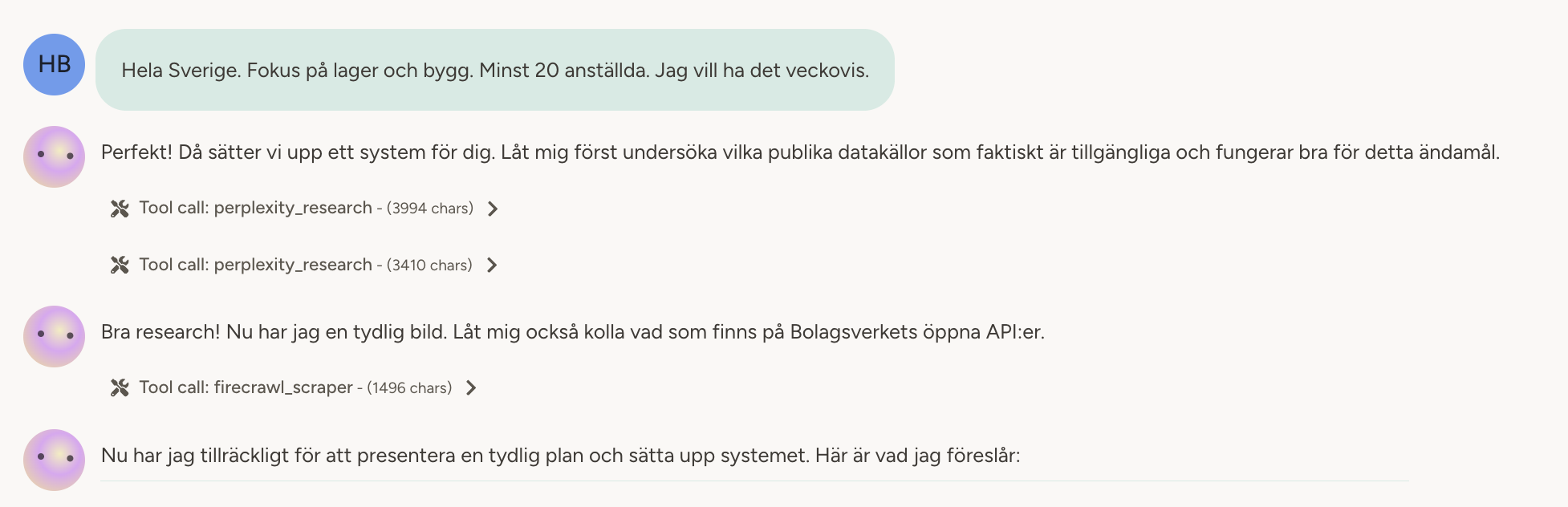 Agenten ställer följdfrågor. Vilka branscher? Vilka datakällor kan vara relevanta? Sedan föreslår den en plan — du beskriver vad du vill, agenten föreslår hur.
