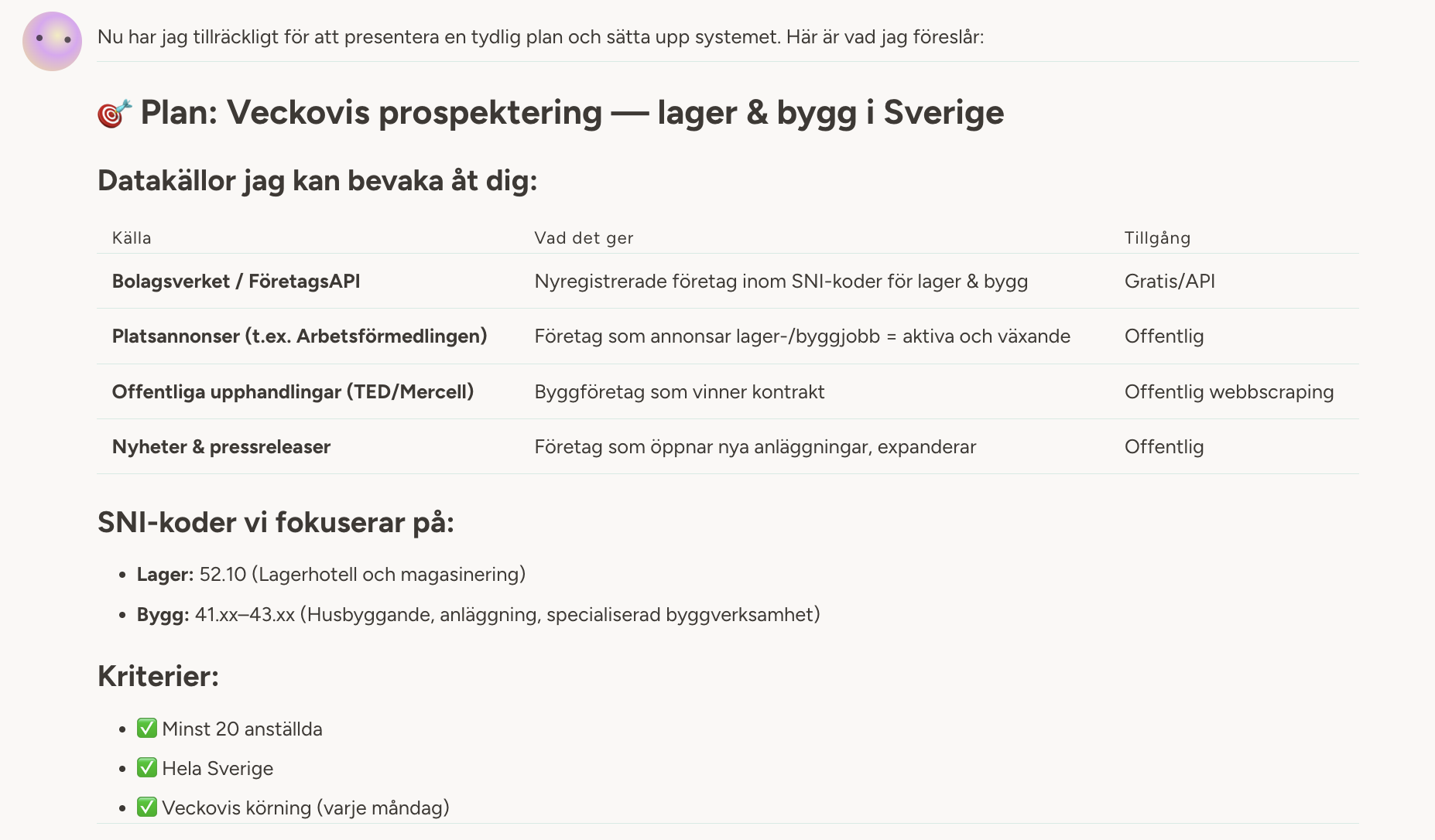 Agenten undersöker vilka offentliga datakällor som finns tillgängliga, testar API:er och sätter ihop en plan. Den presenterar sina fynd — datakällor, kriterier och hur den tänker arbeta.