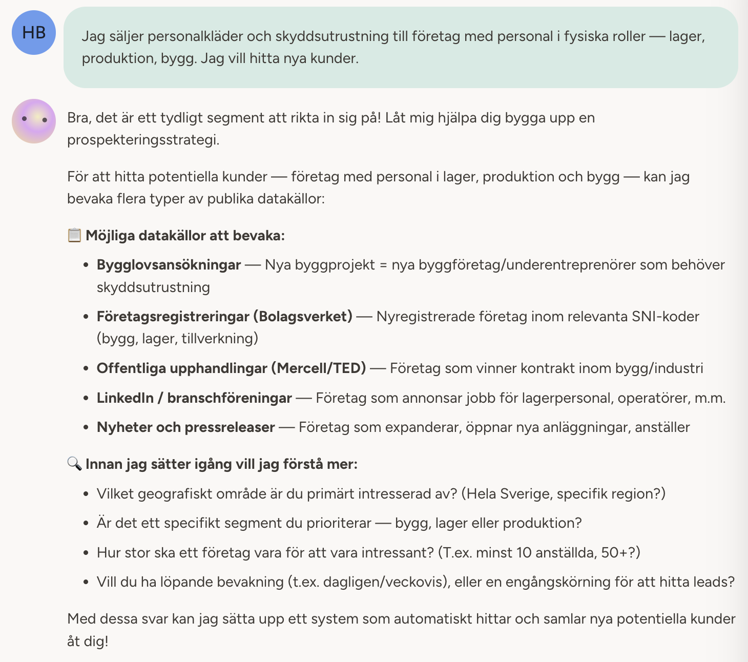 "Jag säljer personalkläder och skyddsutrustning till företag med personal i fysiska roller — lager, produktion, bygg. Jag vill hitta nya kunder."