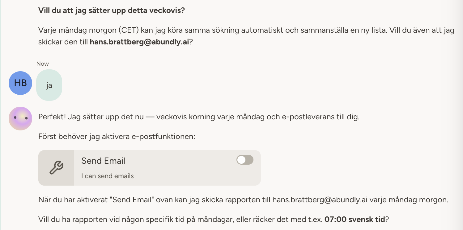 Agenten behöver en ny förmåga — att skicka mejl. Den ber dig slå på den direkt i chatten. Ett klick. Sen uppdaterar agenten sina egna instruktioner så att den vet vad den ska göra varje måndag. Du ser exakt vad den skriver.