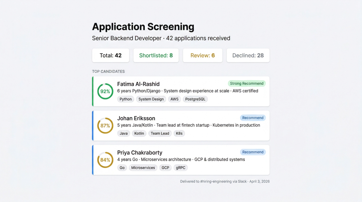 När en kandidat skickar in sin ansökan — via e-post eller ditt ATS — fångar agenten upp den direkt. Den läser CV:t och hämtar kandidatens LinkedIn-profil. Sedan utvärderar den båda utifrån flera dimensioner: matchning mot kravprofilen, erfarenhetens lämplighet för rollen, jämförelse med pipeline-kandidater och kulturell matchning. Varje kandidat får en strukturerad bedömning med tydlig motivering — inte ett poäng, utan en förklaring till varför de fick sin placering. Agenten meddelar ditt HR-team på Slack när en ny ansökan har bedömts. Rekryterare ser resultaten i realtid — utan att behöva kolla ett dashboard eller uppdatera en inkorg. Fråga den "Hur förhåller sig den här kandidaten till de tre starkaste i pipelinen?", "Vilka sökande har starkast kulturell matchning men saknar ett specifikt tekniskt krav?" eller "Visa mig kandidater med icke-traditionell bakgrund som fick högt på rollpassning" — och få ett välgrundat svar baserat på samma kriterier som tillämpats på varje ansökan.