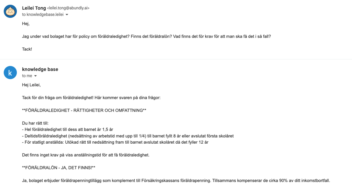 Employees get instant, accurate answers to common questions — no waiting for someone to check their inbox, no hunting through outdated wiki pages. The agent draws from your policies, handbooks, and internal documentation to respond in under a minute. When questions require human judgment or sensitivity, the agent recognizes this and routes them to the right HR colleague with full context.