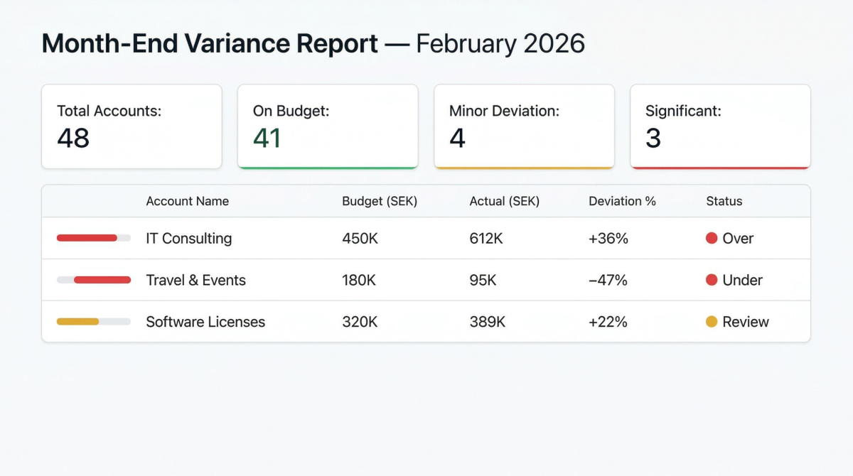 Bokföringsdata finns där – i ditt bokföringssystem, fullständig och uppdaterad. Men att omvandla rådata till en meningsfull bild av vad som förändrats och vad som kräver åtgärd är manuellt arbete. Någon måste exportera siffrorna, ta fram förra månadens utfall, stämma av mot budget och gå igenom jämförelsen rad för rad. Det tar tid. Det kräver fokus. Det är repetitivt arbete som tröttar ut och skapar fel. Men det är inte det enda problemet. Under tidspress är det lätt att missa en kostnad som krypit uppåt. Eller en intäktsrad som legat under budget i två månader i rad. De avvikelser som spelar störst roll är inte alltid de uppenbara.