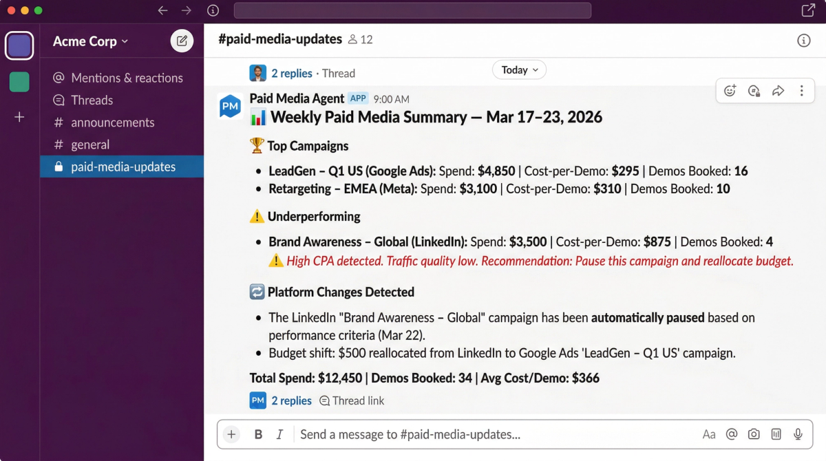 Veckovis insyn i paid media-spend, pipeline-effekt och kampanjprestanda — levererat till ditt team på Slack