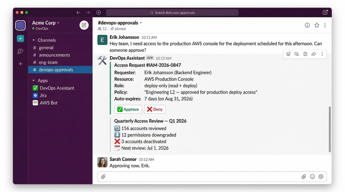 The agent removes the two biggest risks in access management: the human error that comes from repetitive admin work, and the silent accumulation of permissions that comes from never having time to review.