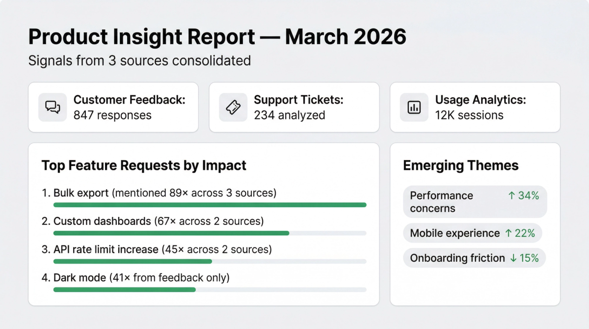 Customer feedback, usage analytics, and support tickets — aggregated into one consolidated view, available the moment you need it.