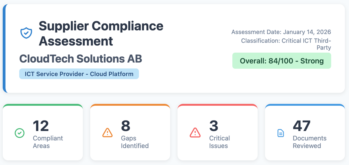 Every new supplier brings risk. Assessing that risk shouldn't require weeks of PDF hunting and fragmented checklists. This agent researches suppliers, maps findings against your compliance framework, and delivers thorough and consistent assessment reports.