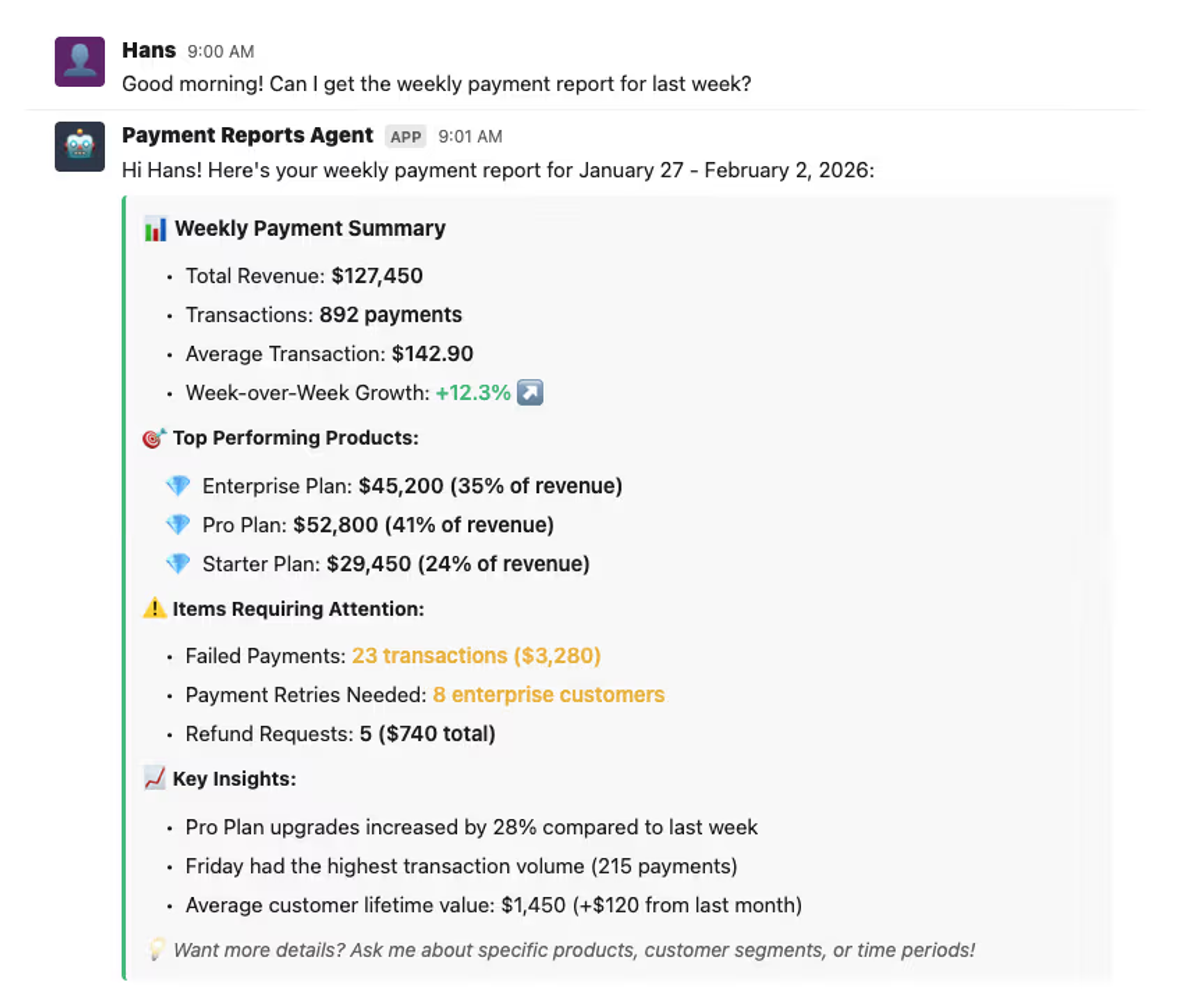 Every Monday morning, a formatted summary lands in your Slack channel — total revenue, transaction count, week-over-week changes, top products, failed payments, anything unusual. No one had to log in, export, or build a spreadsheet. And because the agent stores historical data, it spots patterns over time that a manual weekly glance would miss. Want to dig deeper? Just ask: "What were our top products last week?" "Show me failed payments from enterprise customers." "How does this week compare to the same period last month?" The agent fetches fresh data from Stripe and gives you an answer with the numbers to back it up.